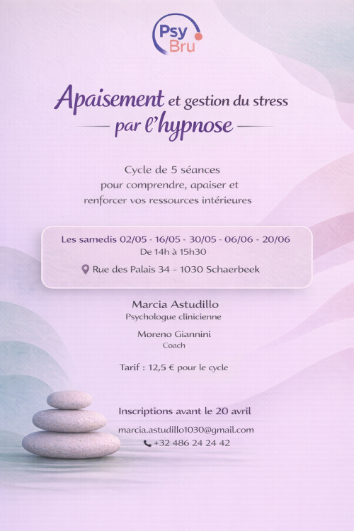 Nous animons un groupe de soutien destiné aux personnes qui souhaitent souffler, s’apaiser et mieux comprendre leur stress, l’apaiser et développer des outils concrets pour mieux le gérer au quotidien. Au fil de cinq séances, nous utilisons une approche douce basée sur l’hypnose d’inspiration Ericksonienne qui permet de renforcer ses ressources et retrouver un espace intérieur de calme. Chaque rencontre se déroule dans un cadre bienveillant, respectueux du rythme de chacun.