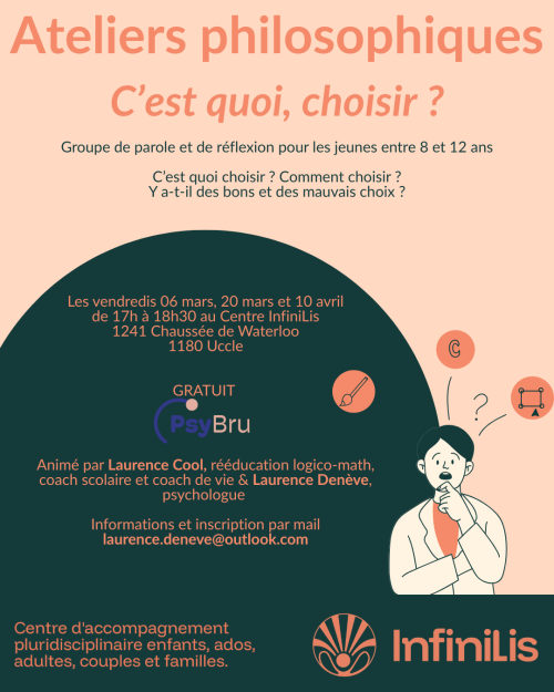 À travers ce cycle d’Ateliers philosophiques : C’est quoi, choisir ?, les enfants et adolescents de 8 à 12 ans sont invités à explorer cette question fondamentale de manière ludique, créative et réflexive. En trois séances progressives, ils réfléchiront d’abord à ce qu’est un choix, interrogeront ensuite l’idée de bons et de mauvais choix, avant d’expérimenter la prise de décision collective.