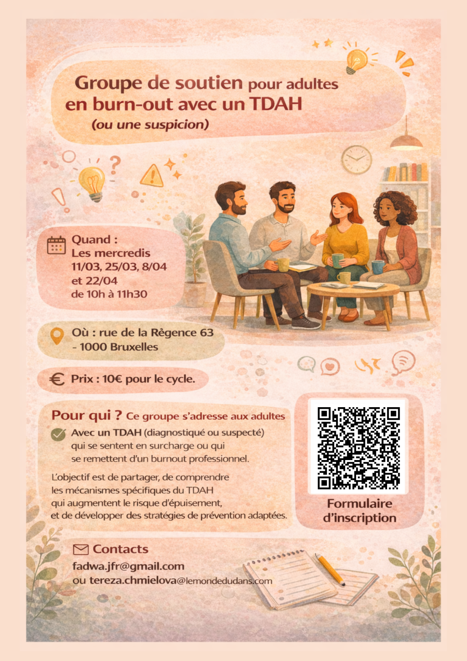 Ce groupe s’adresse aux adultes avec un TDAH (diagnostiqué ou suspecté) qui se sentent en surcharge ou qui se remettent d’un burnout professionnel.