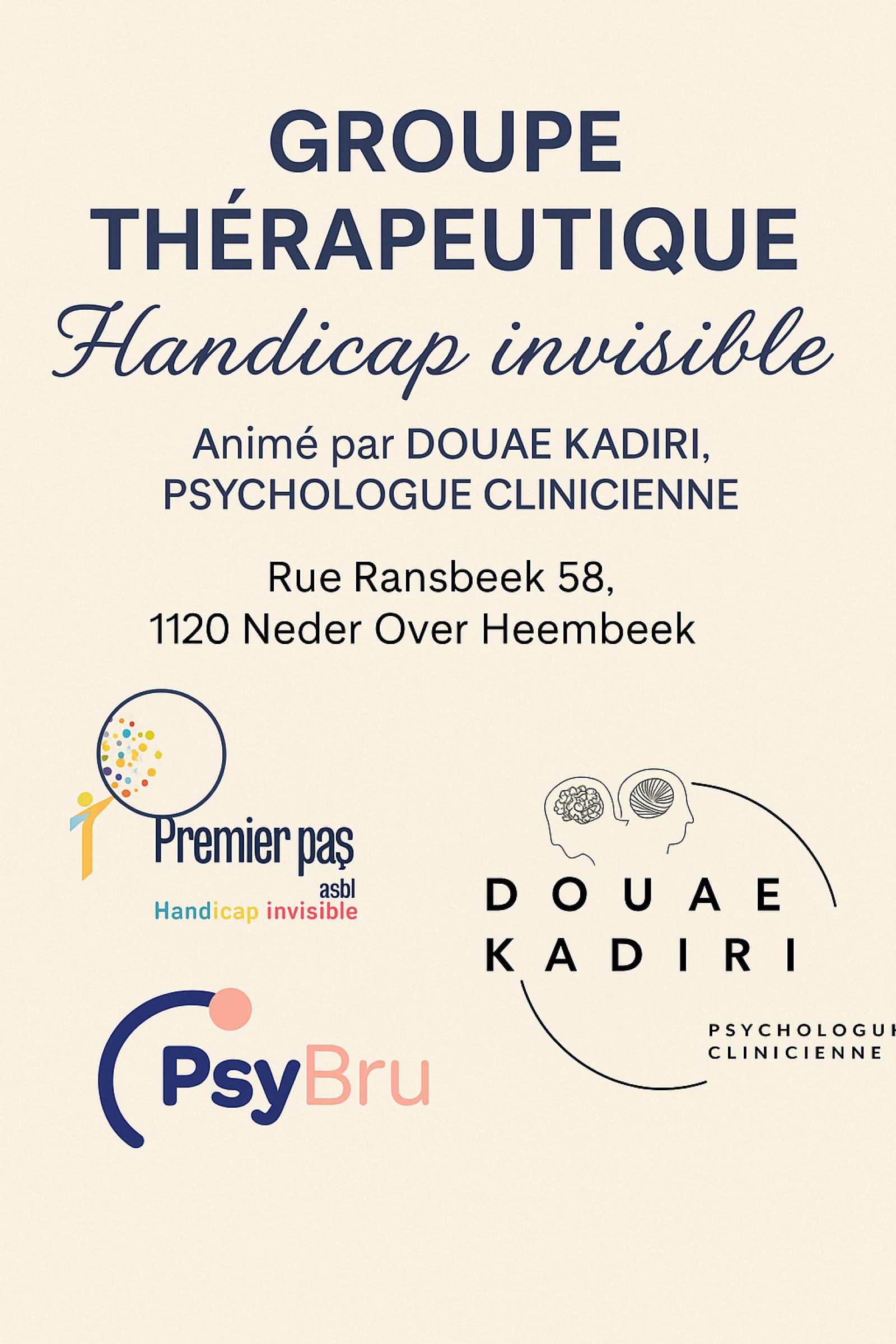 Handicap Invisible est un groupe thérapeutique destiné aux femmes et jeunes femmes vivant avec un handicap invisible (douleurs chroniques, fatigue, troubles de santé…). Ce dispositif offre un cadre bienveillant et sécurisé pour échanger, partager ses ressources, exprimer ses émotions et trouver du soutien. Animé par une psychologue clinicienne en collaboration avec l’ASBL Premier Pas, il vise à favoriser un travail thérapeutique de groupe, à sensibiliser et à rompre l’isolement.
