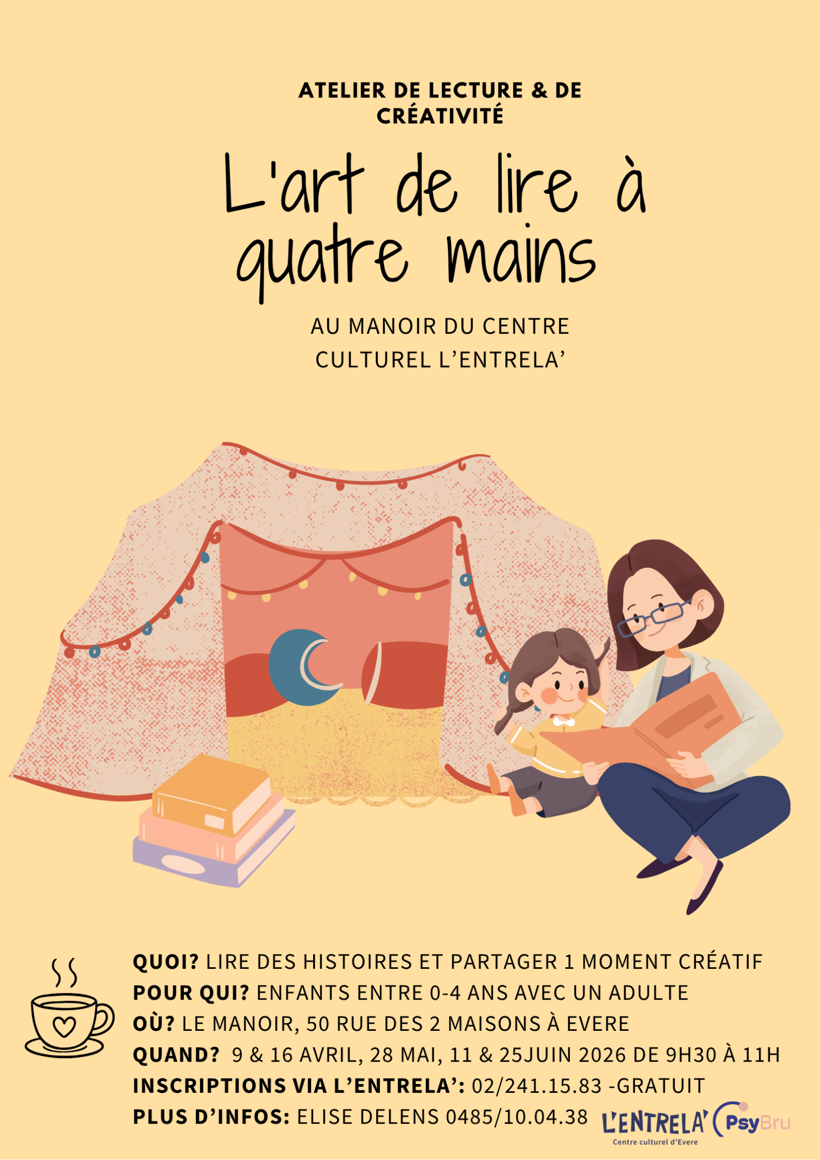 - Ça se passe comment ? Nous proposons un module de 5 dates entre avril et juin (9 et 16/4, 28/5, 11 et 25/6). Nous aurons préparé un petit espace tout cosy et adapté aux plus jeunes pour vous accueillir au « manoir », espace du centre culturel d’Evere, l’Entrela’. Pendant 1h30, nous découvrirons une histoire ensemble et vous proposerons une petite activité créative en lien et adaptée à l’âge de vos enfants.
