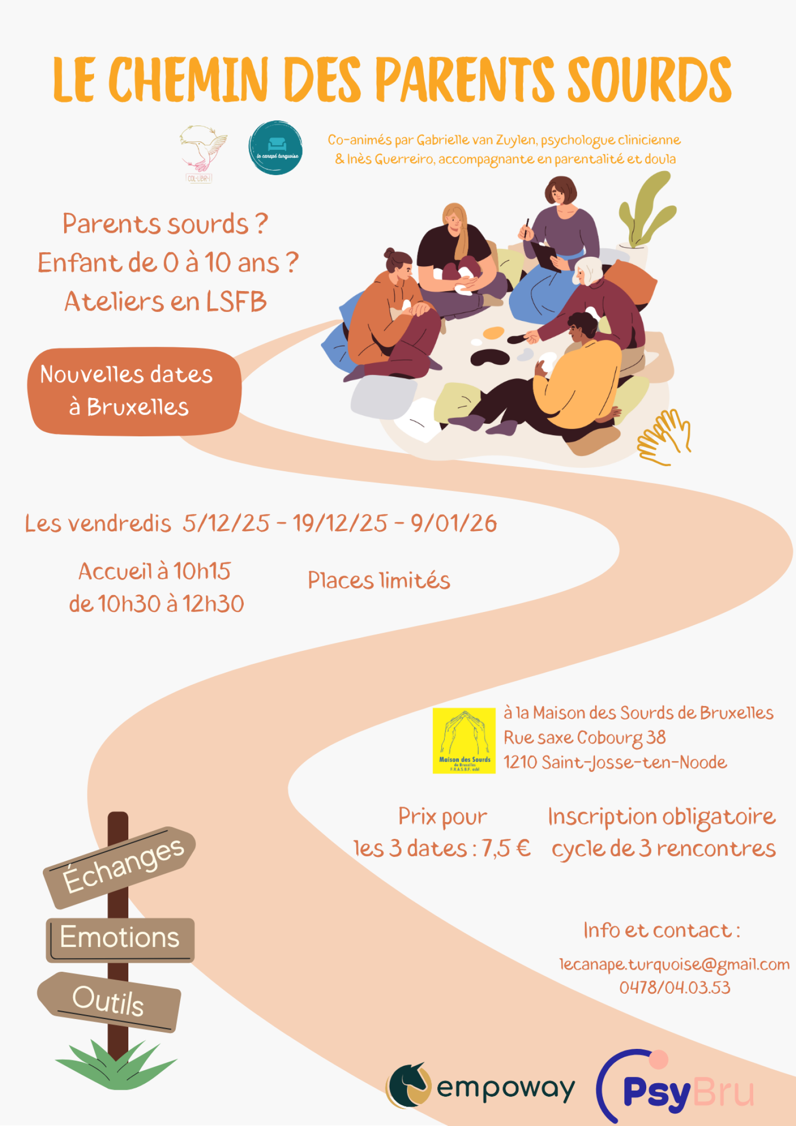- Recevoir des outils à appliquer au quotidien L’inscription se fait pour tout le cycle. Il est important d’être présent aux 3 ateliers. Inscription obligatoire par mail (lecanape.turquoise@gmail.com) ou par WhatsApp au 0478/04.03.53 Informations pratiques : —> le vendredi 5/12/25, 19/12/25 et 9/01/25, accueil à 10H15. L’atelier est de 10H30 à 12h30. Prix pour les 3 ateliers : 7,5 euros. Les ateliers ont lieu à la Maison des Sourds de Bruxelles (rue Saxe-Cobourg 38), 1210 saint-Josse-ten-Noode