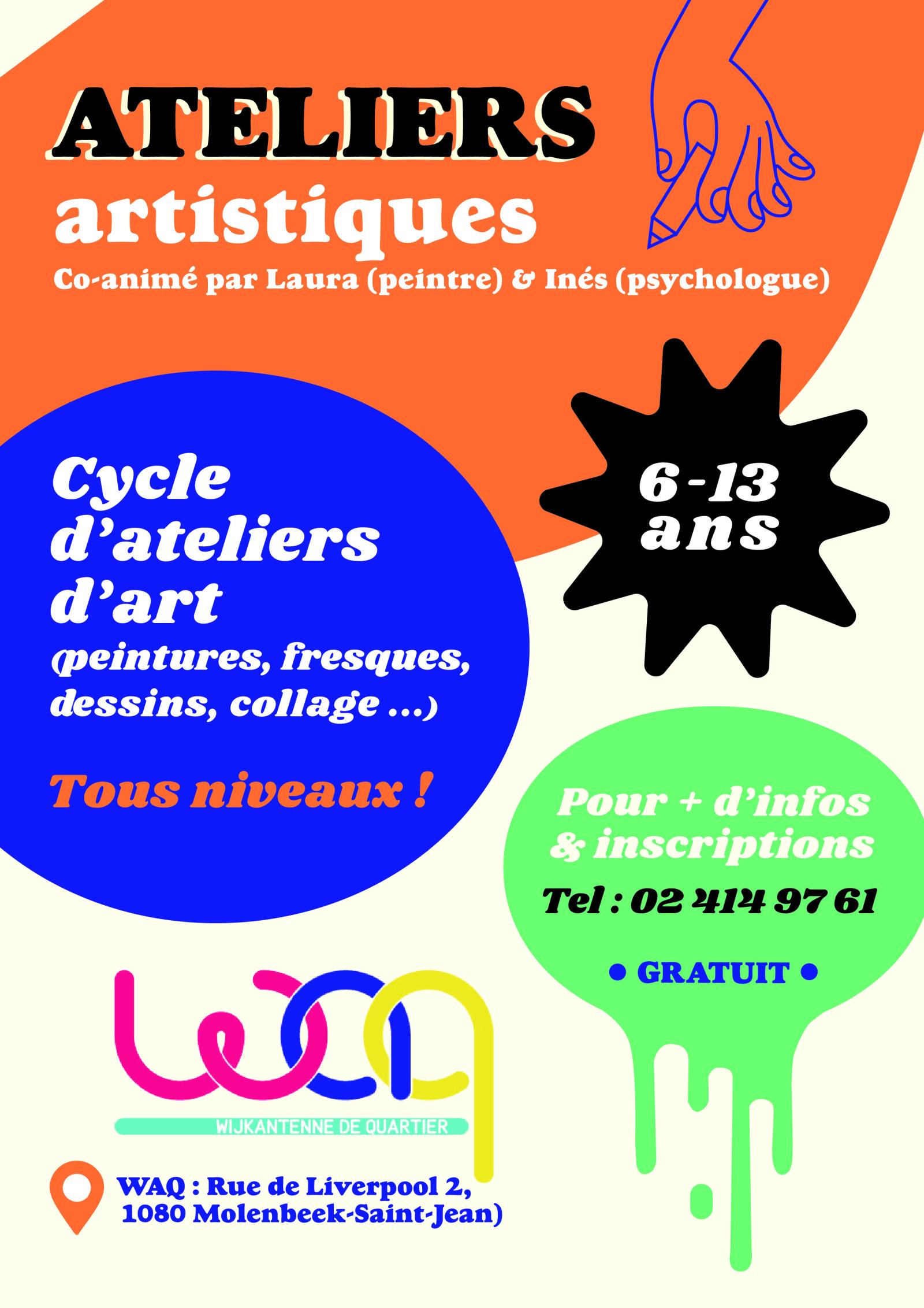 Nous lançons un atelier d’expression corporelle et artistique à visée thérapeutique, spécialement conçu pour les enfants de 7 à 13 ans. Cet atelier s’adresse particulièrement aux enfants traversant des situations difficiles et qui n’ont pas encore toutes les clés pour mettre des mots sur ce qu’ils ressentent. À travers le mouvement, le geste et la création artistique, les enfants découvrent une nouvelle façon d’exprimer et transformer leurs émotions. ? Ici, l’art et le mouvement ouvrent la voie à l’expression, au partage et à la transformation intérieure. Pour plus des infos et Inscriptions: Laura Quémerais, tel: +32 487 39 80 34 Inés Serani, tel: +32 472 60 28 26 Contacter Maison du quartier Waq Molenbeek: +32 490 67 47 86