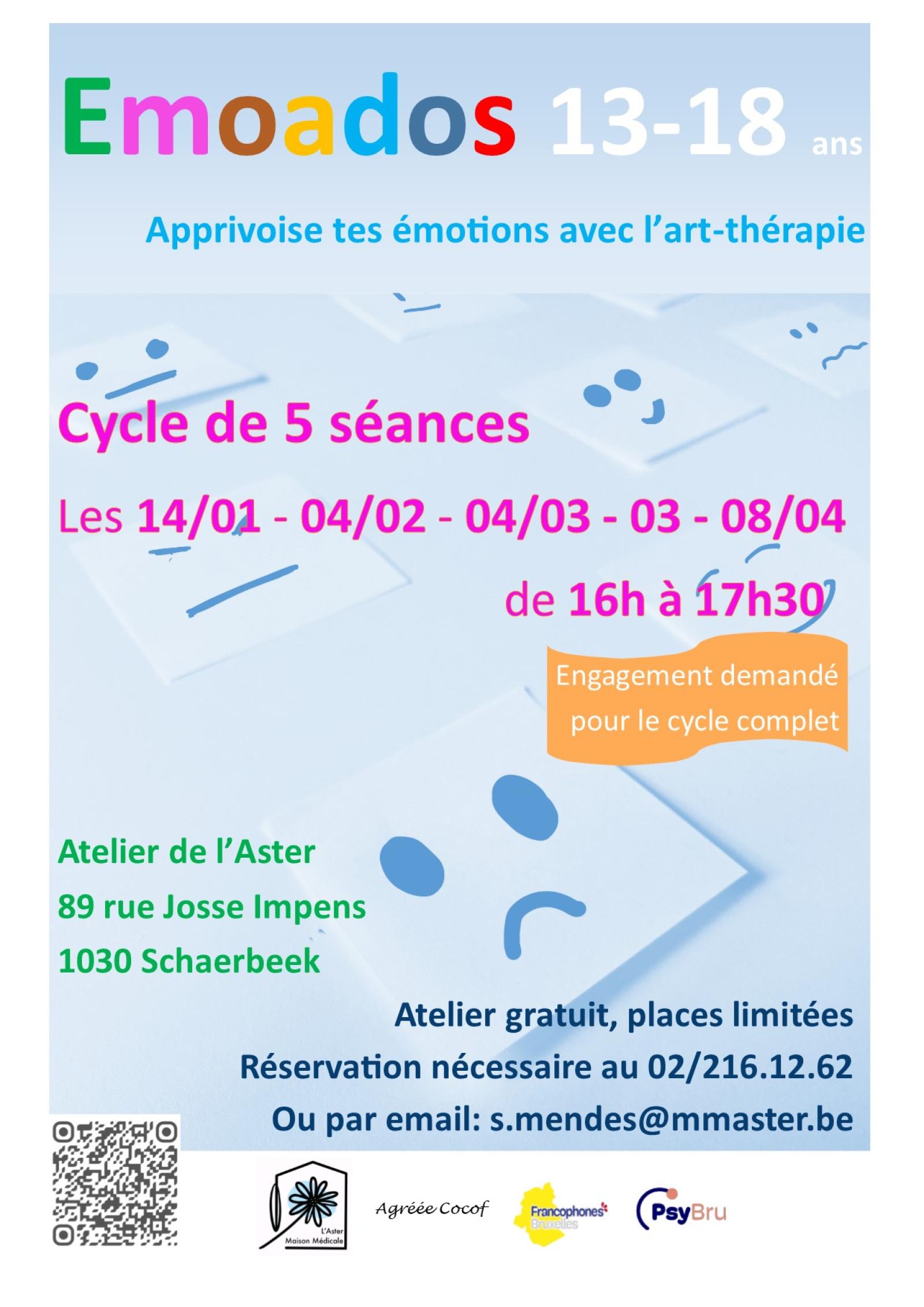 Pour les jeunes de 13 à 18 ans A l’atelier de L’Aster au 89 rue Josse Impens à Schaerbeek. Début du prochain groupe en Janvier 2026. Pour participer, il suffit de t’inscrire en téléphonant à l’accueil de la Maison Médicale L’Aster 02.216.12.62 ou par mail s.mendes@mmaster.be. En cas de désistement, nous te demandons de nous prévenir à l'avance afin de pouvoir attribuer la place à un.e autre jeune.